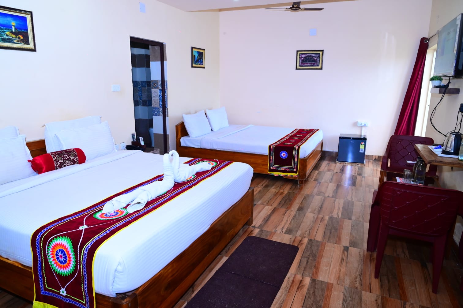 The Deluxe AC Room offers a comfortable and refreshing stay with a perfect blend of style and convenience. Elegantly designed, the room is equipped with air conditioning to ensure a pleasant indoor temperature at all times. It features a spacious and well-appointed bed, clean linens, modern furnishings, and ample storage space. Guests can enjoy an attached bathroom with quality fittings, hot and cold water supply, and essential toiletries. Ideal for couples and business or leisure travelers, the Deluxe AC Room provides a relaxing ambiance with enhanced comfort for a memorable stay.