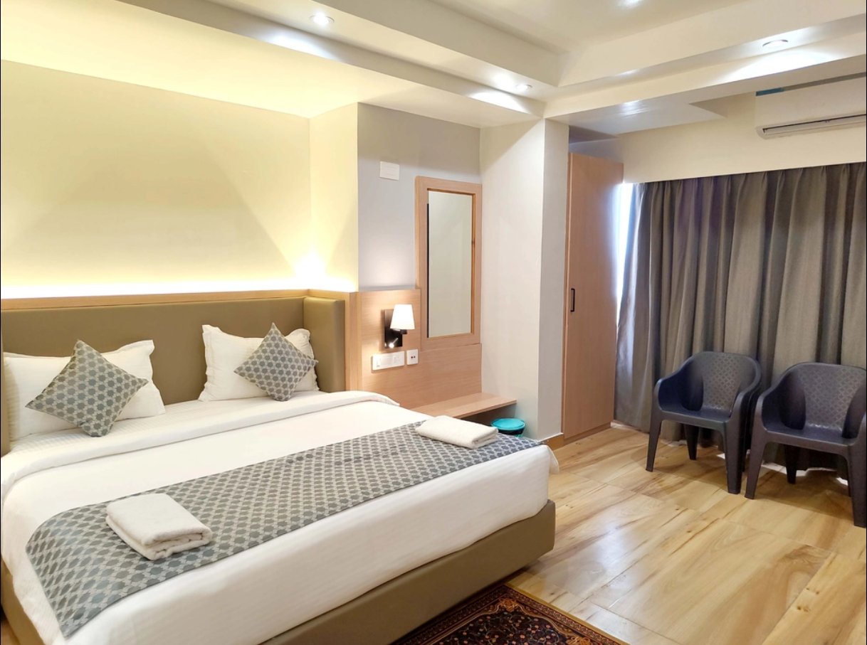 The Deluxe Double Bedroom (AC) at Grand Resort Puri is a comfortable retreat just 200 meters from Golden Beach. It features a king-size bed with Egyptian cotton sheets and a memory foam mattress. The room includes air conditioning, a 24-inch LED TV, and a work desk. Large windows offer natural light and city views.
